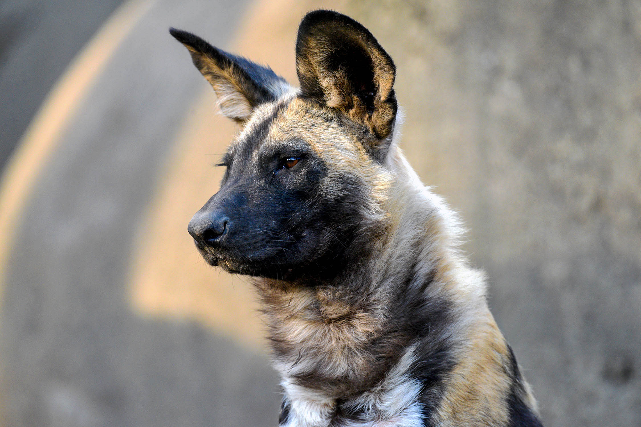 The short fur of African painted dogs is a patchwork of dark brown, yellow, black, and white. Although the color pattern is different for each individual, they all have darker colors on their muzzle and a white tip on the end of their tail. Their ears are large and rounded, and they have a strong musky odor. Unlike other canids, all of their teeth are sharp and shearing rather than a combination of sharp and flattened teeth.