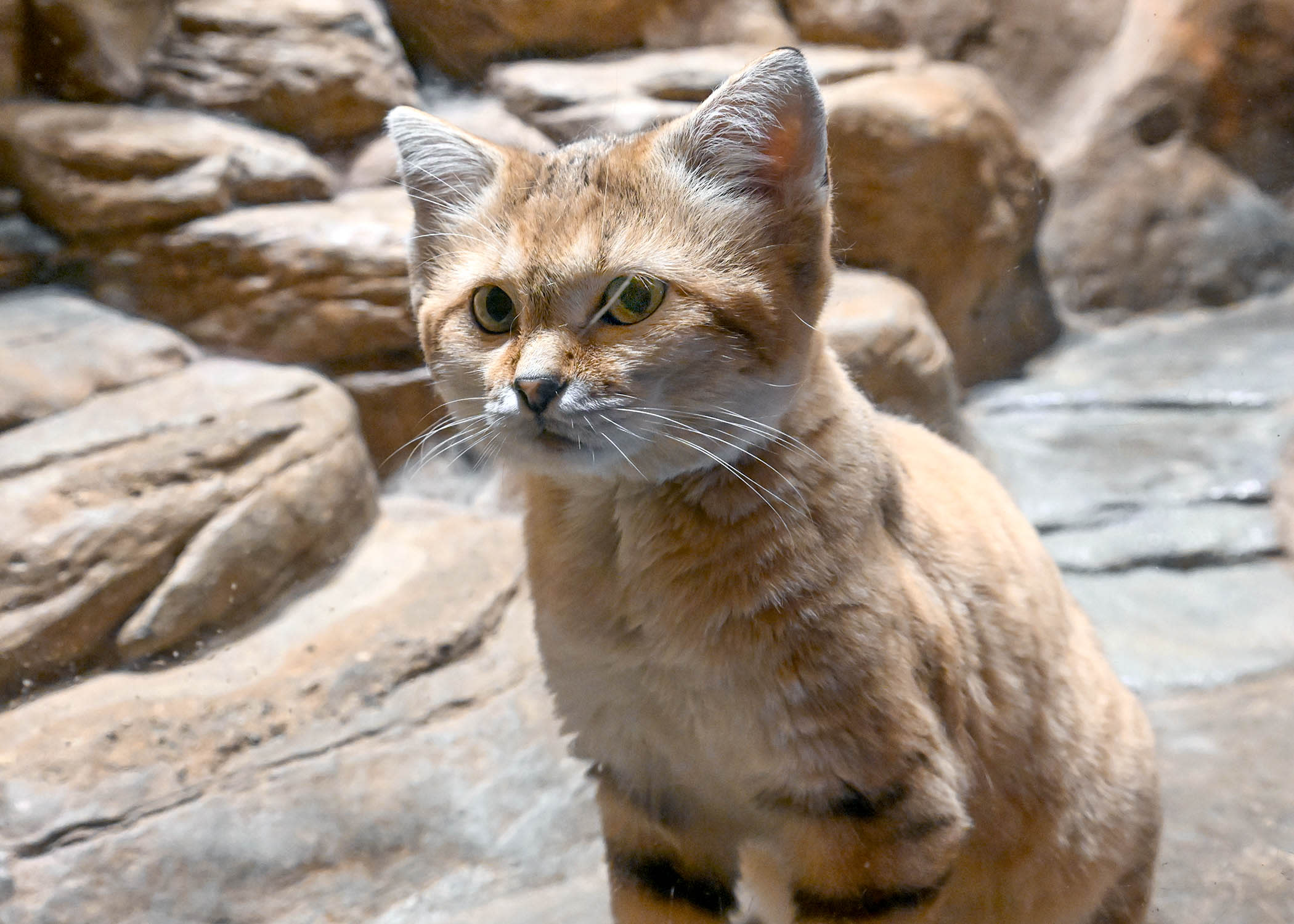 Sand cats are one of the smallest wild cats. Their fur is sandy-colored, from light tan to gray-brown, with darker backs and very pale bellies. Some have stripes on their legs. They have red streaks on their cheeks that start at the corners of their eyes. Sand cats have wide heads, big eyes, low-set ears, and short legs. Males are a bit bigger than females.
