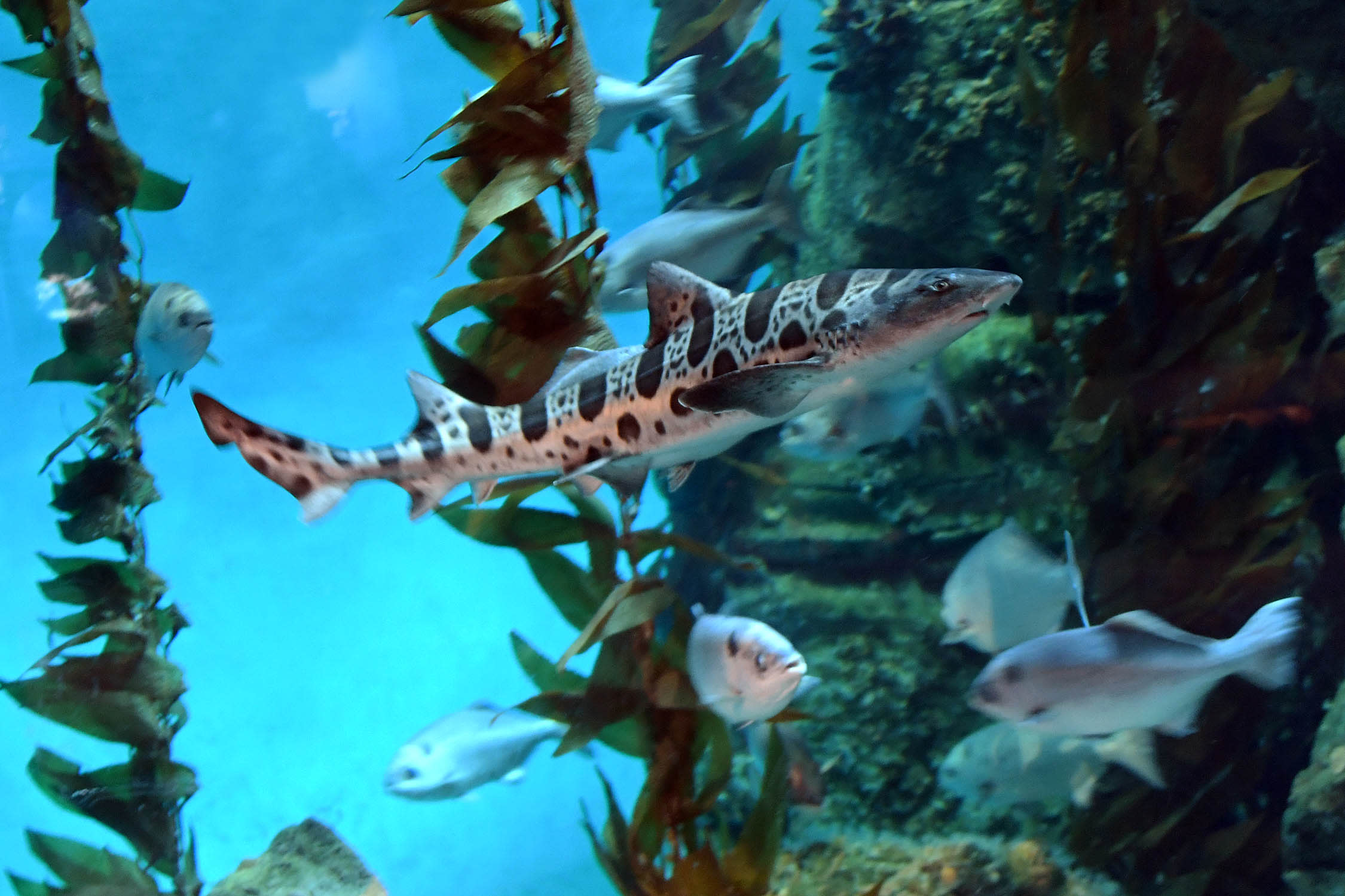 Leopard sharks are small sharks that live in shallow coastal waters, bays, and estuaries along the Pacific coast of North America. They are easy to recognize by their silvery gray bodies covered with dark saddle-shaped markings and spots. These sharks usually swim in large groups and are most active at night, when they hunt for fish, crabs, clams, and worms along the sandy or muddy seafloor. Leopard sharks tend to stay in the same area throughout their lives and rarely travel long distances.